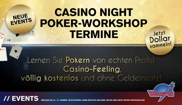 Sichere dir noch heute deinen kostenlosen Teilnahmegutschein für unsere Casino Night Events mit Poker Workshop! Frag einfach unsere freundlichen Mitarbeiter in den Vulkan Spielhallen nach dem nächsten Event und dem genauen Termin.